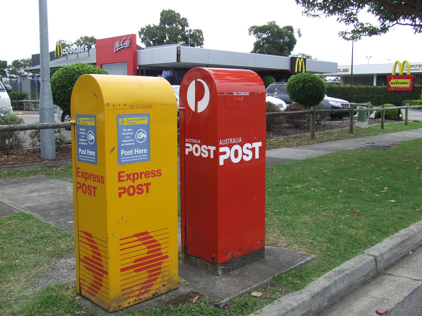 Postman. Milky lime is the new safety yellow. Lower: Merewether Post Office 2291, original, with public or pay phone and postboxes outside the door.